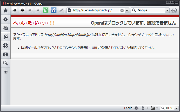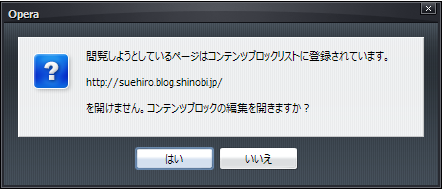 で、ここからはネタが混じった要望みたいなものなんだけど、コンテンツブロックに入ってるURLを直接開こうとすると飛べなかったり、空白のページが開いたりするじゃないですか。分かり辛いと思うんですよ、特に初心者さんなんかは。Operaが壊れちゃったと思って再インストールなんかしたりして、いえ私の経験談なんですがね。