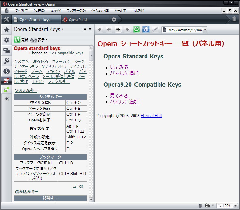 果たして需要があるのか判らないけど、Opera ショートカットキー 一覧 (パネル用)を作ってみた。Opera9.50以降、Windows用です。