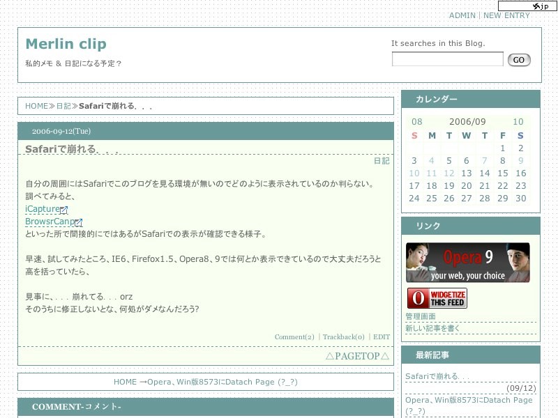 早速、試してみたところ、IE6、Firefox1.5、Opera8、9では何とか表示できているので大丈夫だろうと高を括っていたら、