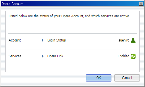 上のダイアログでOpera LinkをDisableにするとステータスバーのSyncアイコンがグレーに変るので”Sync login”を実行してOpera Linkダイアログを表示させてみたところ。